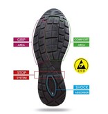 + extra Abdämpfung durch Antishock im Fersen + sportliche Optik + neuartige Zehenschutzkappe mit dünnerem Material für mehr Platz im Zehenbereich. |